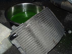 で、これが取り外したラジエーター本体っす。冷却ファンなどは付いていないのでホント簡単に取り外せます。これを自宅に持ち帰り、風呂場でジャバジャバお湯で内外ともに洗い流しました。 そうそう、前回クーラント交換したのははっきり言って忘れてしまったほど遥か昔のです。少なくとも4,5年は前でしょう。私はてっきりもしかしたらヘドロと化しているかも?!なんてびくびくしていましたが、とりあえず緑色はしてました。但し、くすんでましたけど(笑)確かに内部は湯垢のようなゴミだらけ。 |