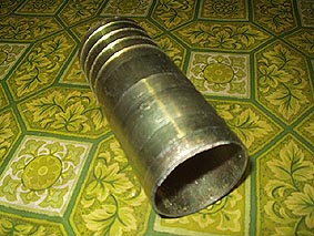 それから、フォークシール打ち込む際の特工ってお高いじゃないですか。メーカー純正品だと目ん玉飛び出るくらいですし、安売り汎用品でも4千円くらいしちゃいますね。そんな滅多に使うものでもないし、そんなもんに数千円も掛けてらんね〜!・・・というわけで、私はホームセンター内を目を皿のようにして闊歩しましたよ。最初は水道管とかの「塩ビ管」なんかどうかな?と手に取ってみたのですが、残念ながら使えそうなサイズのが見当たらず断念しました。他になにかなかんべ〜かと見渡しているところに、ふと目に止まったのが・・・「ホースのジョイント金具」でした。 各種サイズも揃っていて、見事インナーチューブ径41φに使えそうな金具を見つけました。むふふ・・・これならいけるっしょ!ホームセンターでのお値段「380円なり〜(税抜)」 ちなみにこれは「正立フォーク」にしか使えませんので悪しからず。