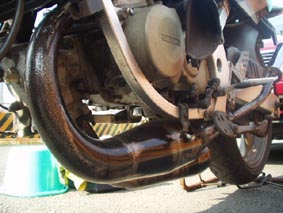 そのチャンバー、どアップ! 錆び錆びだったものをひたすらペーパー掛けで錆びを落として再度耐熱ブラックを.....と思ったらそのペーパー掛けただけの状態が結構「芸術」っぽくて気に入ってしまったので、そのまま耐熱の「クリア」を吹いて下地のムラムラを敢えて見せてみました。 ですが、実際にはアンダーカウルで隠れちゃうんですけどね〜〜〜(T^T) |