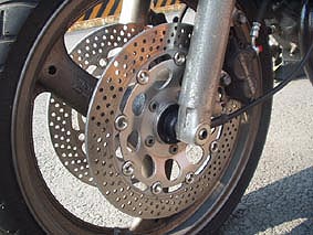 ブレーキディスクはホイールから取り外してそれぞれ綺麗に錆び落し汚れ落してクリーンナップ!もちろんキャリパーとマスターシリンダーも全バラしてのO/Hを施しました。ブレーキラインをそれまでのガッツンブレーキだったメッシュホースをノーマルのゴムホースに換えてブレーキタッチのマイルド化を図ろうと思ったのですが、逆に思いっきりマイルドすぎてしまい.....ふにゃふにゃに(汗)これはなんとか対策せねばと思っている次第です。