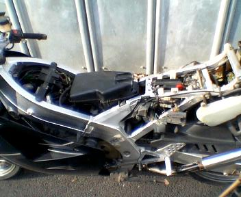 ひっさびさに身包み剥いでみました。 そういえばガソリンタンクの中のガソリンって一体いつ入れたものだったっけ・・・?(爆)エンジン掛けてオイルを回すためだけに入っているようなものです。まだ異臭は放ってないようです(笑) |